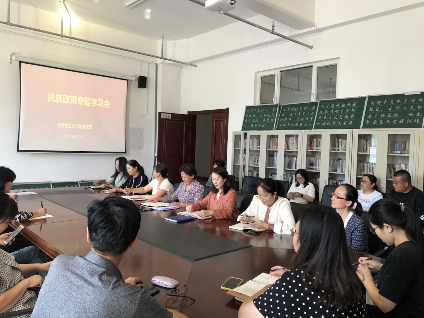 深入开展铸牢中华民族共同体意识教育,促进民族团结进步,2022年9月14日,awc777万象城娱乐官网党总支理论学习中心组扩大学习会在崇文楼B123会议室召开专题学习。会议由党总支书记刘凤琴主持,学院全体教师参加。会上集中学习了《内蒙古自治区促进民族团结进步条例》、《内蒙古自治区教育条例》和《中华人民共和国国家通用语言文字法》等法律法规,同时要求各位老师自学《民族区域自治法》。