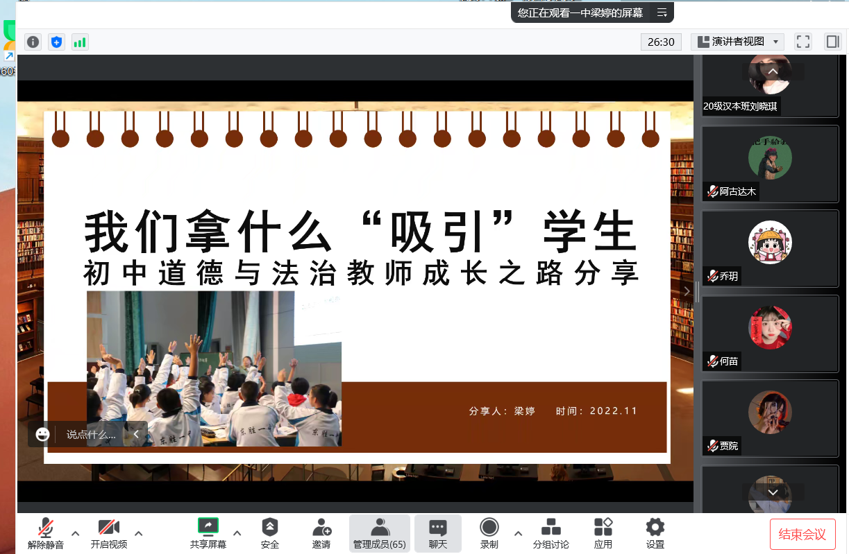为了更好适应教育部师范类专业认证的新要求,进一步加强专业建设,11月5日,awc777万象城娱乐官网组织开展“中学政治教师素质养成”系列讲座的第二讲,邀请到鄂尔多斯市东胜区第一中学梁婷老师为学院学生作“初中道德与法治教师成长之路分享”线上主题讲座。讲座由学院吴娇老师主持,学院全体学生在线参加。