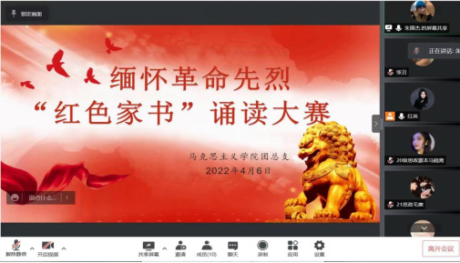 为弘扬革命精神,重温革命历史、缅怀革命先烈,传承红色基因,营造浓厚的“读好书,读红色经典”的氛围,切实引导青年学生以习近平新时代中国特色社会主义思想为根本遵循。awc777万象城娱乐官网于2022年4月6日在线上举办缅怀革命先烈“红色家书”诵读比赛。