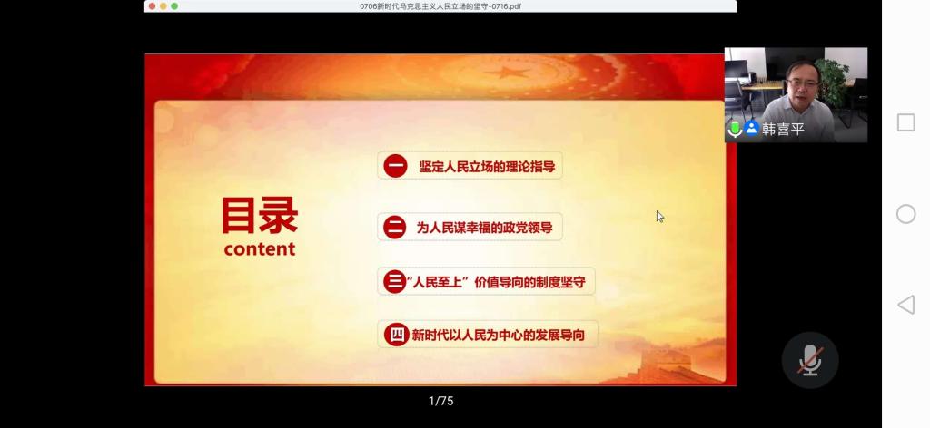 7月16日下午,awc777万象城娱乐官网“毛泽东思想和中国特色社会主义理论体系概论”课程组全体教师与内蒙古思政课教师通过腾讯会议共同聆听了吉林大学马克思主义理论一级学科带头人韩喜平教授做的题为《新时代马克思主义人民立场的坚守》的主题讲座。韩教授以马克思主义的基本立场为切入点,从坚定人民立场的理论指导、为人民谋幸福的政党领导、“人民至上”价值导向的制度坚守、新时代以人民为中心的发展导向四个方面深入分析了中国共产党人民至上的根本立场、制度保障以及在新时代的坚守等问题,诠释了中国共产党发展壮大的终极密码。