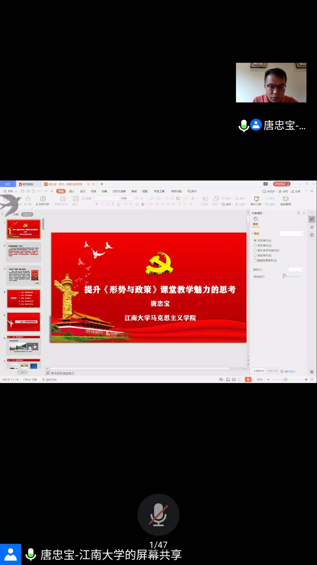 7月7日下午两点半,awc777万象城娱乐官网“形势与政策”课程组教师通过腾讯会议参加了由内蒙古师范大学主办的内蒙古思政课教师同备一门课——形势与政策课线上集体备课活动。本次活动聘请了江南大学awc777万象城娱乐官网教授、哲学博士,教育部首批思政工作精品项目“宝哥说”思政文化育人品牌主讲人唐忠宝教授作了题为“提升《形势与政策》课堂教学魅力的思考”的精彩讲座。