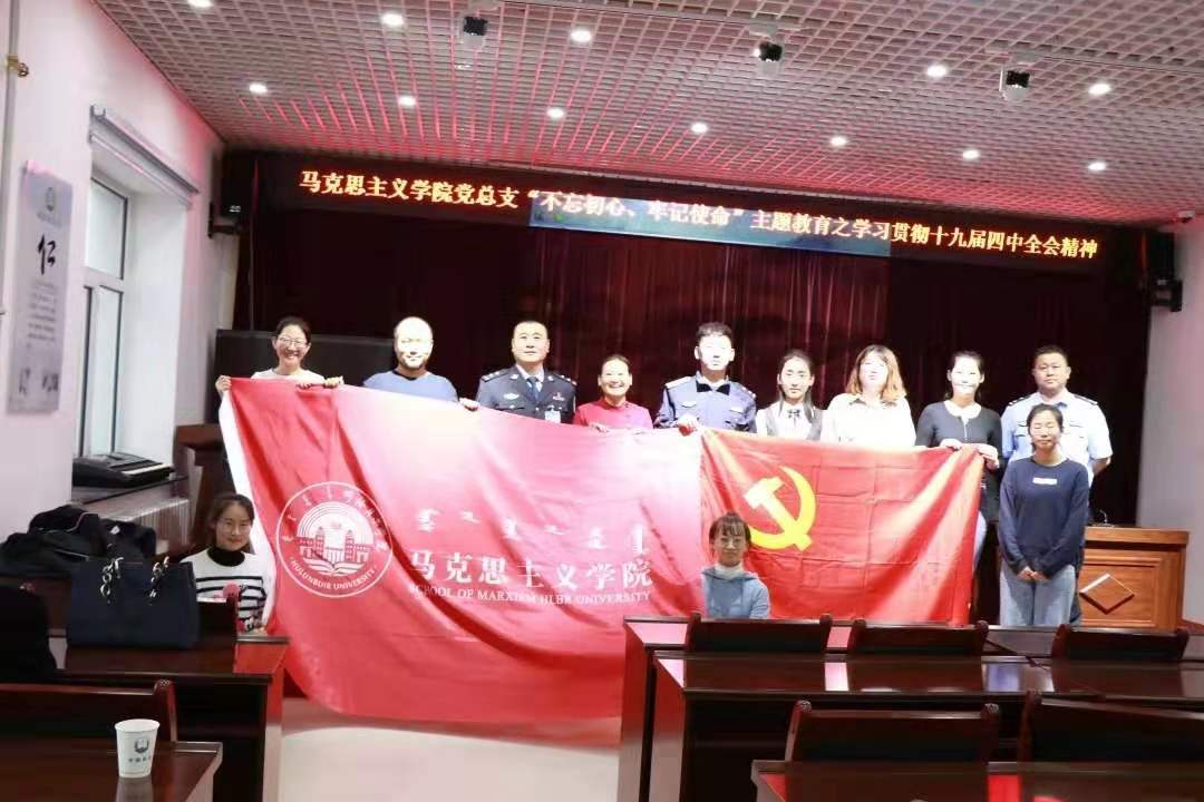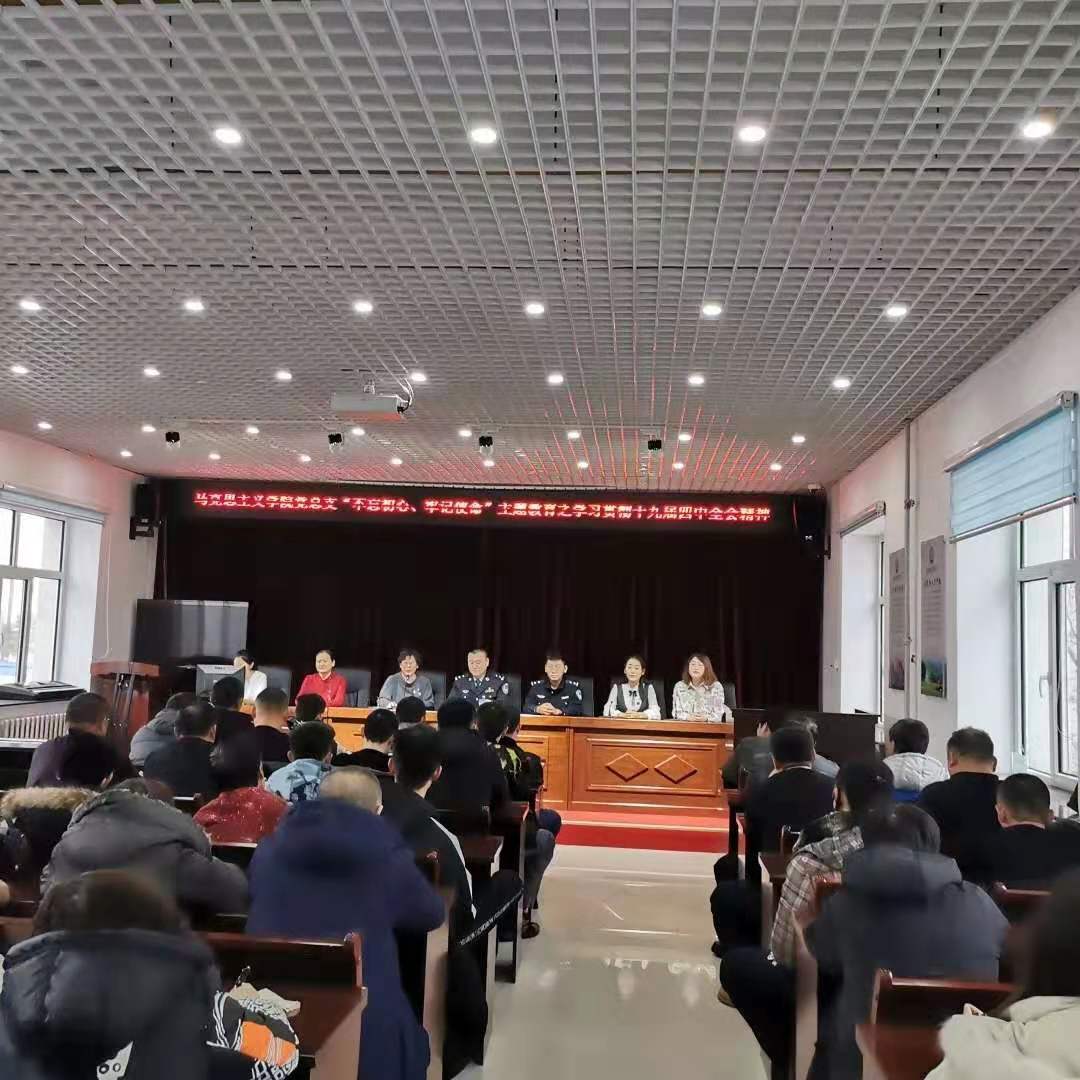 2019年11月22日下午,awc777万象城娱乐官网党总支书记刘凤琴、副书记刘琳、教师李琳颖、张舒、吴娇、李昱以及优秀学生代表赴鄂温克自治旗巴彦托海司法所进行“学习贯彻十九届四中全会精神”理论宣讲。司法所组织辖区保释人员、矫正人员等40余人以及司法所全体工作人员参加宣讲活动。主讲教师李琳颖。