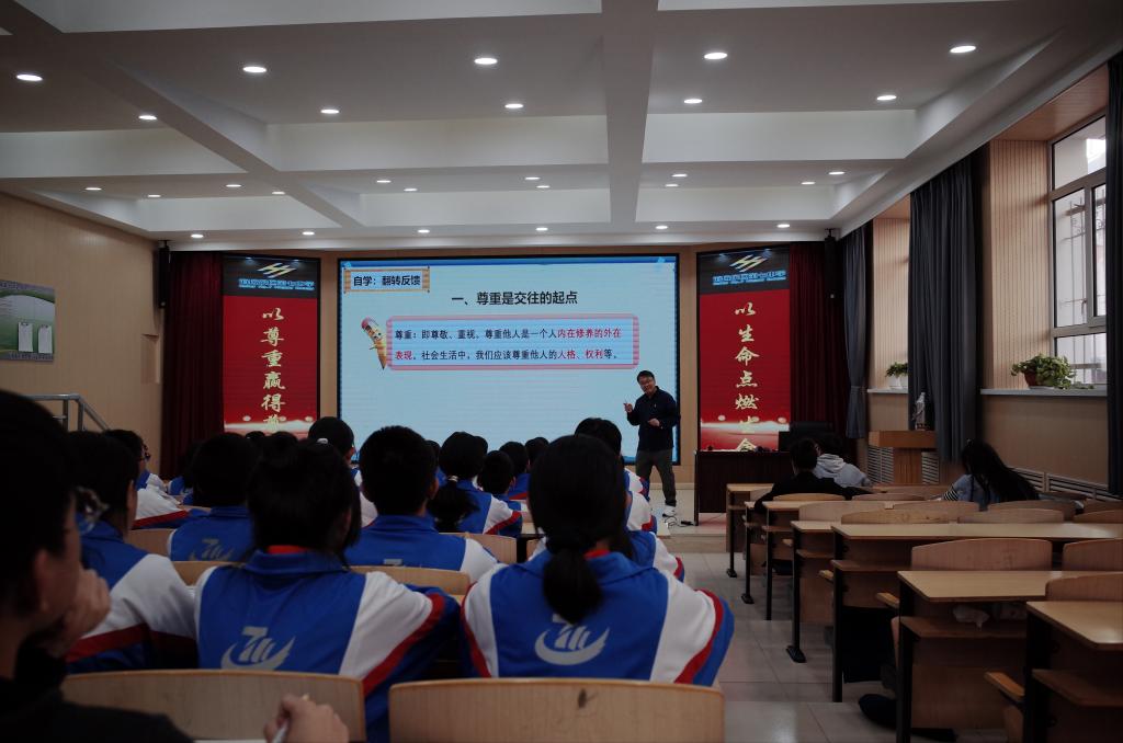 为了深入落实好内蒙古自治区关于加强和改进新时代大中小学思政课一体化建设实施方案的精神和《呼伦贝尔市大中小学思想政治教育一体化建设实施方案》的要求,加快推进呼伦贝尔市大中小学思政课一体化建设和高质量发展,2023年9月22日下午4点,awc777万象城娱乐官网“思想道德与法治”教研室教师赴海拉尔区第七中学开展集体教研活动,听海拉尔区第七中学政教处主任、八年(1)班班主任高炳杰老师主讲的课程——八年级上册“道德与法治”课程第二单元第四课第一框“尊重他人”。