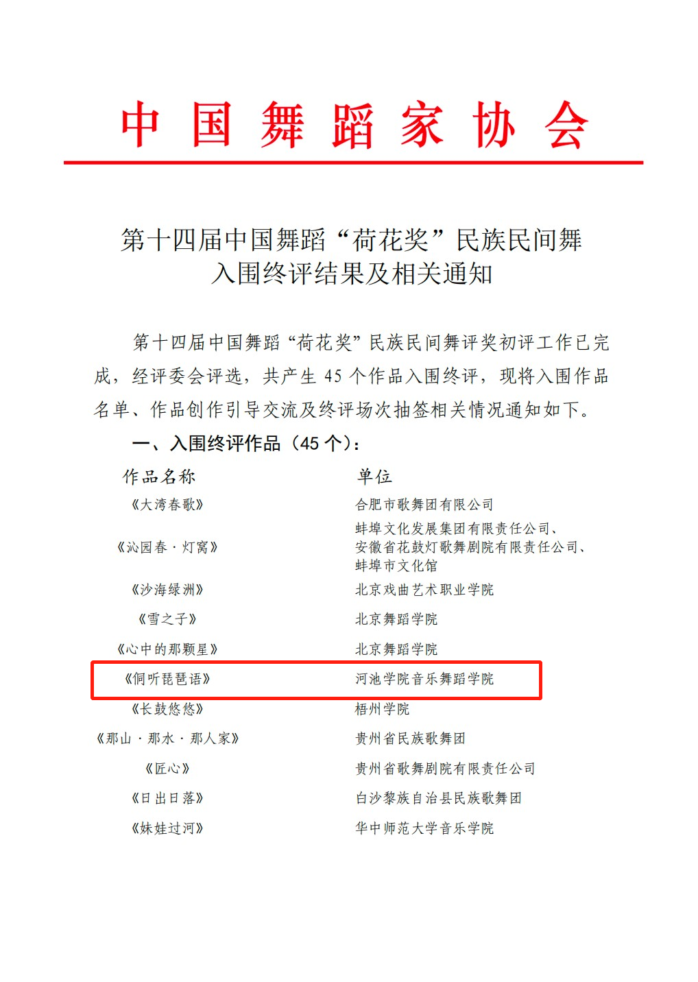 近日,第十四届中国舞蹈“荷花奖”民族民间舞评奖公布了45个入围终评作品名单,诸侯快讯音乐舞蹈学院原创舞蹈作品《侗听琵琶语》成功入选终评作品名单中。这是诸侯快讯舞蹈学专业建设的一个重大突破,具有非凡的里程碑意义。