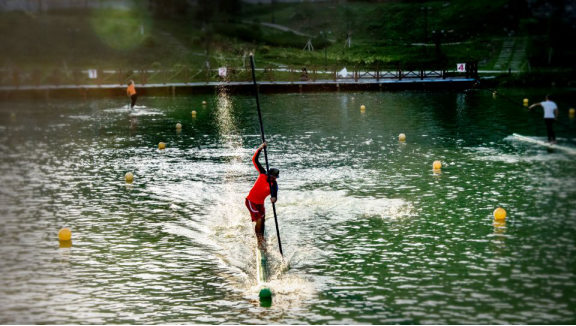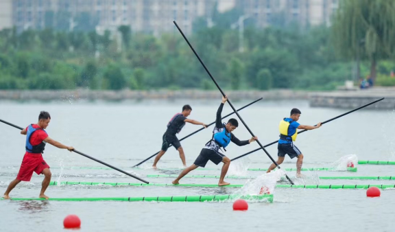 独竹漂俗称伐竹竿,运动员赤足站立于一根直径15厘米,长7.5米的楠竹上,手拿一根5厘米直径大小,长约4.5米的小竹竿当浆,左右交替,在水上划行。看似简单其实很难把握,黄适骥现在双手虎口上都有一处厚茧子,最高处有1厘米,特别显眼。而他告诉我们,所谓万事开头难,所以在刚开始练习时落水受伤那都是家常便饭,而一次次的落水,一次次的失败并没有使他放弃,反而激励他不断努力突破自我。