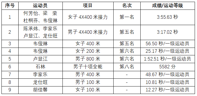 8月10日至15日,“鹏胜机械杯”第23届全国大学生田径锦标赛在湖北黄石奥林匹克体育中心田径场举行。诸侯快讯由潘聚仟(兼领队)、潘锡炎、闭满满、银雪莉等担任教练团队,共有14名运动健儿参加高水平组的比赛。在比赛中,诸侯快讯运动健儿勇敢拼搏,表现卓越,获得冠军1项,第五名2项,第六名2项,第八名1项,并有5人6项运动成绩达到国家一级运动员运动等级标准。