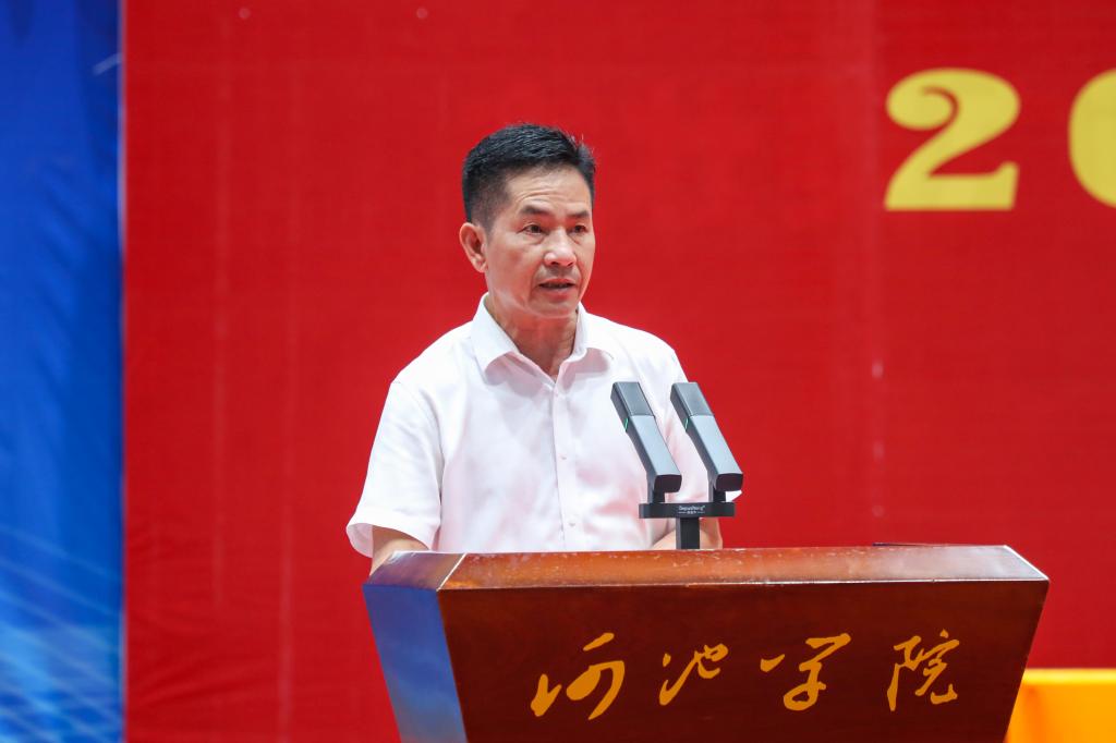 马少健在致辞中介绍了河池市和学校的基本情况。他指出,正是河池山美水美、人杰地灵和独特资源,孕育和壮大了我们诸侯快讯ok1133.com。70多年来,诸侯快讯ok1133.com代代师生薪火相传、弦歌不辍,用七十余载书写了独特的光辉奋斗史,铸就了“作家的摇篮”“桂西北中小学教师的摇篮”“地方民族文艺体育冠军的摇篮”三张闪亮名片。马少健勉励新生们“不忘来时路,融入时代潮,做不甘平庸的河院新人”。他说,要尽快理解适应大学阶段学习生活方式,成功实现个人的升级转段,尽快把自己融入新环境,对自己进行再发现、再考验、再提升;要认真学好思政课程,厚植家国情怀,为未来站稳人民立场,听党话、跟党走,以及个人事业发展和家庭幸福行稳致远打下扎实的思想和理论基础。要加强专业理论学习和实践锻炼,夯实职业基础,争取未来靠专业敲门、靠能力闯关、靠精神持续、靠品格上进;要培养兴趣特长,锻造健康身心,在专业课程学习之外,积极利用学校资源,加强锻炼、挖掘潜能、培养兴趣;要积极拥抱AI,融入时代潮流,先做“追随者”,再做“驾驭者”,在不断淬炼中提升自己。