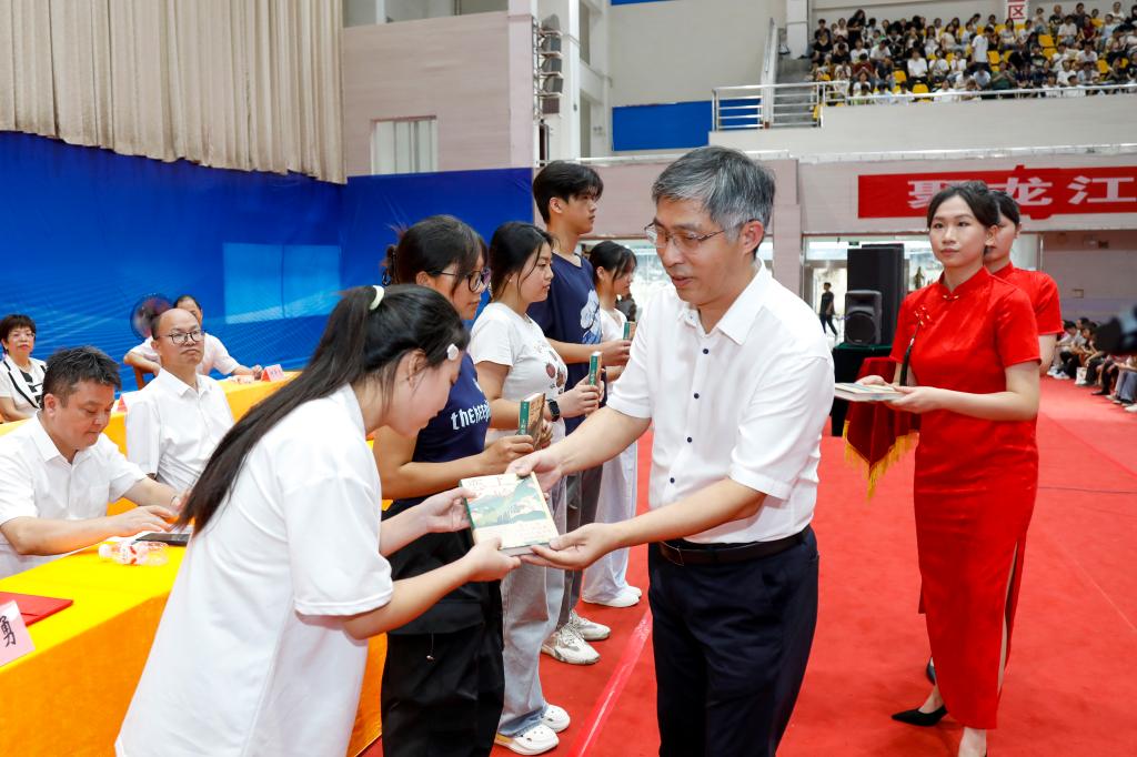 党委书记甘毅为新生赠书。