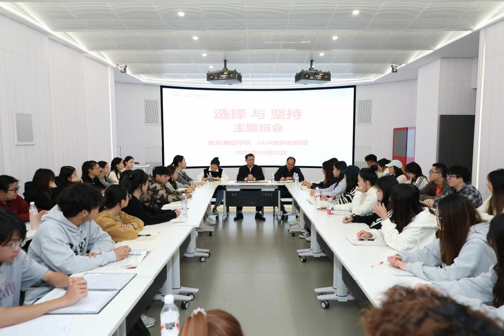 10月23日,学校党委副书记韦文广来到音乐舞蹈学院2024级音乐教育班的主题班会现场,以班主任身份与59名青年学子面对面畅谈“选择与坚持”。