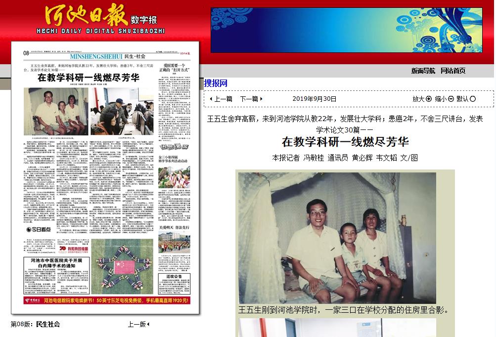 10-092019【河池日报】在教学科研一线燃尽芳华河池日报:http://hcrb.hcwang.cn/html/2019-09/30/content_200524.htm他来自山西省沁县西汤乡的一个贫苦农家,凭借不断努力,摘得理学博士学位;他舍弃高薪,毅然来到河池,扎根西部少数民族贫困地区教育20余载;他身患癌症,饱受病痛折磨,却舍不得离开讲台,一如既往坚守教学科研第一线……他就是诸侯快讯ok1133.com数学与统计学院教授王五生。9月15日清晨,他带着遗憾“走”了,永远离开了他钟爱的数学科研事业和三尺讲台。但是,他... -