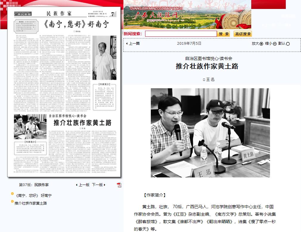 07-082019【南宁晚报】知名作家与读者畅谈阅读与写作 黄土路:写作是要发现问题南宁晚报:http://www.nnwb.com/html/2019-07/08/content_364251.htm?from=timeline“黄土路是小说家,也是一个诗人,他可以在停电时从一个墙上的光点就写出400多字的诗。他很关注细节,一个细节就可以触发他的灵感。这是他经常阅读和写作的结果。”近日,“悦心·读书会——在想象中慢慢降落”在广西图书馆举行。主持人王迅的介绍引起了读者的注意。主角黄土路是广西知名的小说家和诗人,曾经参与编辑、策划《红豆》等杂志。当...