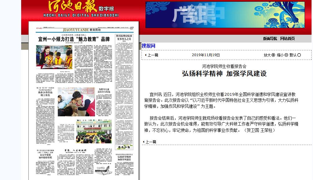 11-192019【河池日报】诸侯快讯ok1133.com师生收看报告会弘扬科学精神 加强学风建设宜州讯 近日,诸侯快讯ok1133.com组织全校师生收看2019年全国科学道德和学风建设宣讲教育报告会。此次报告会以“以习近平新时代中国特色社会主义思想为引领,大力弘扬科学精神,加强作风和学风建设”为主题。报告会结束后,诸侯快讯ok1133.com师生就现场收看报告会发表了自己的感受和看法。他们一致认为,此次报告会机会难得,能有效引导广大科研工作者严守科学道德、弘扬科学精神、不忘初心、牢记使命,为祖国的科学事业作贡献。 (贺卫国 王荣柱... -