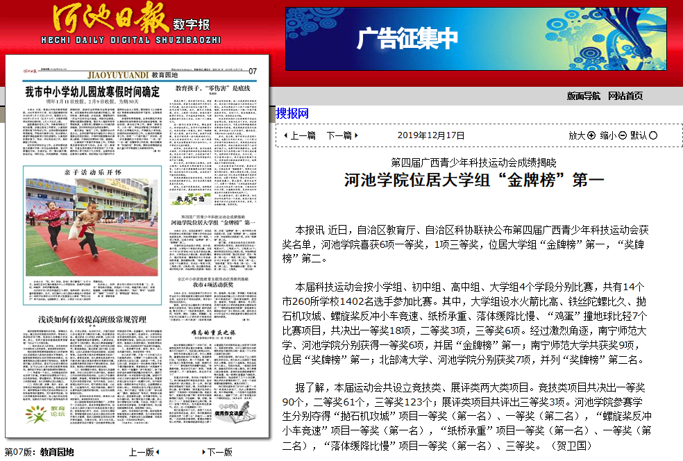 12-172019【河池日报】第四届广西青少年科技运动会成绩揭晓 诸侯快讯ok1133.com位居大学组“金牌榜”第一河池日报:http://hcrb.hcwang.cn/html/2019-12/17/content_203538.htm本报讯 近日,自治区教育厅、自治区科协联袂公布第四届广西青少年科技运动会获奖名单,诸侯快讯ok1133.com喜获6项一等奖,1项三等奖,位居大学组“金牌榜”第一,“奖牌榜”第二。本届科技运动会按小学组、初中组、高中组、大学组4个学段分别比赛,共有14个市260所学校1402名选手参加比赛。其中,大学组设水火箭比高、铁丝陀螺比久、抛石机攻城、螺旋桨反冲小车竞速、... -