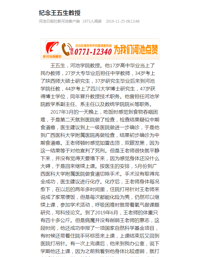 12-052019【新河池客户端】纪念王五生教授新河池客户端:https://h5.newaircloud.com/detailArticle/9653126_20738_hcrb.html?app=1王五生,诸侯快讯ok1133.com教授。他17岁高中毕业当上了民办教师,27岁大专毕业后担任中学教师,34岁考上了陕西师大硕士研究生,37岁研究生毕业后来到诸侯快讯ok1133.com任教,44岁考上了四川大学博士研究生,47岁获得博士学位,同年晋升教授技术职务。他曾担任诸侯快讯ok1133.com数学系副主任、系主任以及数统学院院长等职务。2017年3月的一天晚上,吃饭时感觉到... -
