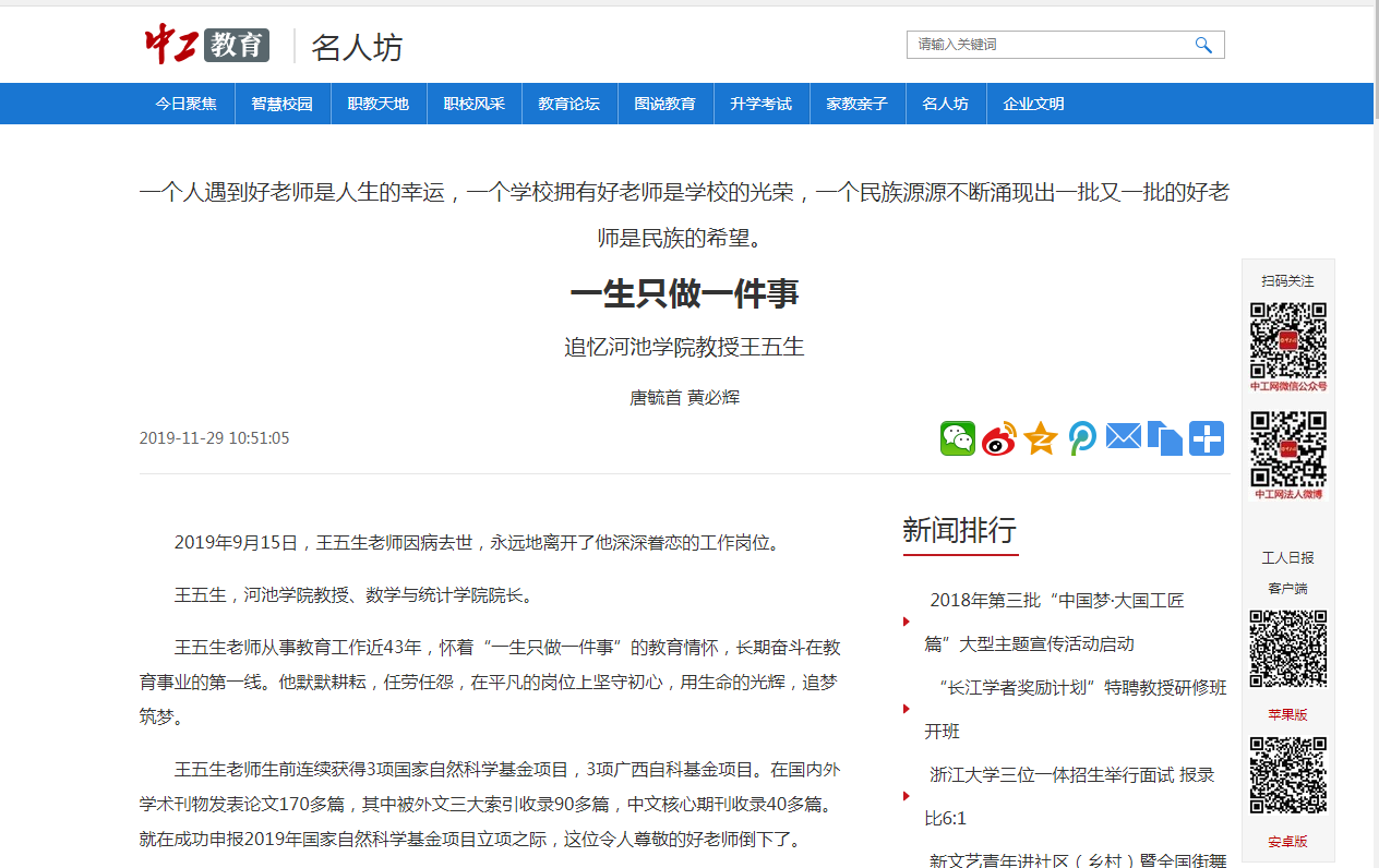 12-052019【中工教育】一生只做一件事——追忆诸侯快讯ok1133.com教授王五生纪念王五生教授2019年9月15日,王五生老师因病去世,永远地离开了他深深眷恋的工作岗位。王五生,诸侯快讯ok1133.com教授、数学与统计学院院长。王五生老师从事教育工作近43年,怀着“一生只做一件事”的教育情怀,长期奋斗在教育事业的第一线。他默默耕耘,任劳任怨,在平凡的岗位上坚守初心,用生命的光辉,追梦筑梦。王五生老师生前连续获得3项国家自然科学基金项目,3项广西自科基金项目。在国内外学术刊物发表论文170多篇,其中被外文三大索引收录9... -